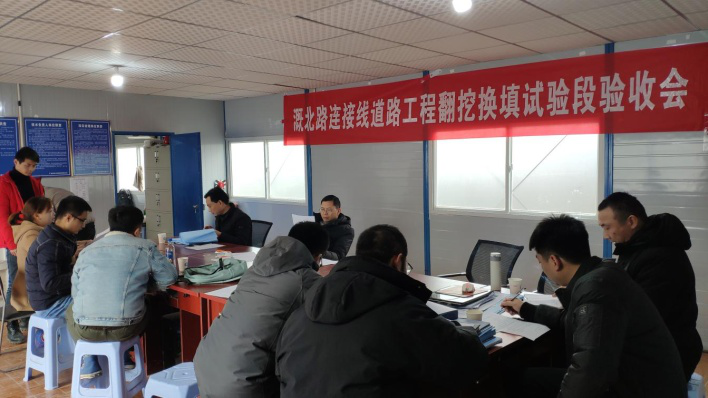 與會(huì)人員按程序?qū)Ψ趽Q填試驗(yàn)段的現(xiàn)場(chǎng)施工質(zhì)量情況進(jìn)行了詳細(xì)察看;隨后,在溉北路連接線道路工程項(xiàng)目部現(xiàn)場(chǎng)辦公室對(duì)其質(zhì)量進(jìn)行了客觀評(píng)定。