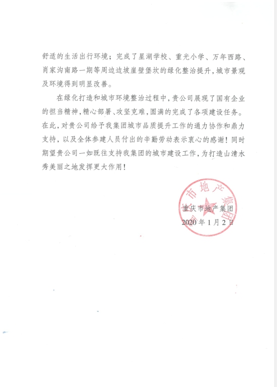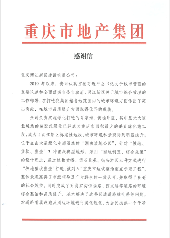 來源:本站 發(fā)布日期:2020/1/19 【打印此文】1月8日,兩江建設(shè)公司承接的地產(chǎn)集團照母山片區(qū)綠化品質(zhì)提升工程(一期)項目喜獲業(yè)主重慶市地產(chǎn)集團的感謝信,信中對公司項目管理團隊展現(xiàn)了國有企業(yè)敢于擔(dān)當(dāng),勇于拼搏的優(yōu)良作風(fēng)給予了高度評價。