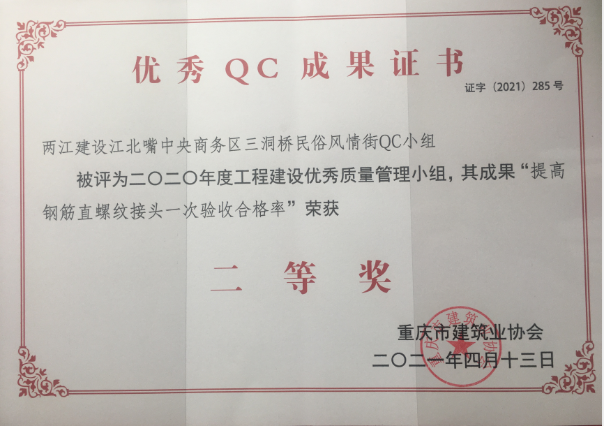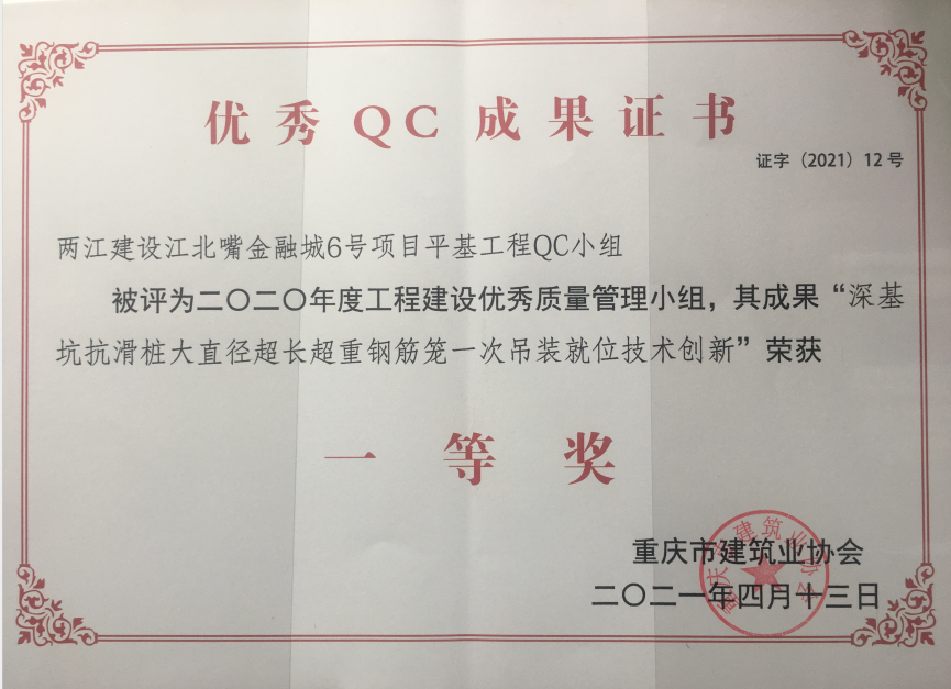 來源:總工辦 林彬 發(fā)布日期:2021/4/16 【打印此文】近日,兩江建設公司三個質(zhì)量QC小組成果榮獲了重慶市2020年度工程建設優(yōu)秀質(zhì)量管理小組“高回填復雜場地旋挖樁成孔方法的技術創(chuàng)新”和“深基坑抗滑樁大直徑超長超重鋼筋籠一次吊裝就位技術創(chuàng)新”兩個一等獎,“提高鋼筋直螺紋接頭一次驗收合格率”二等獎。