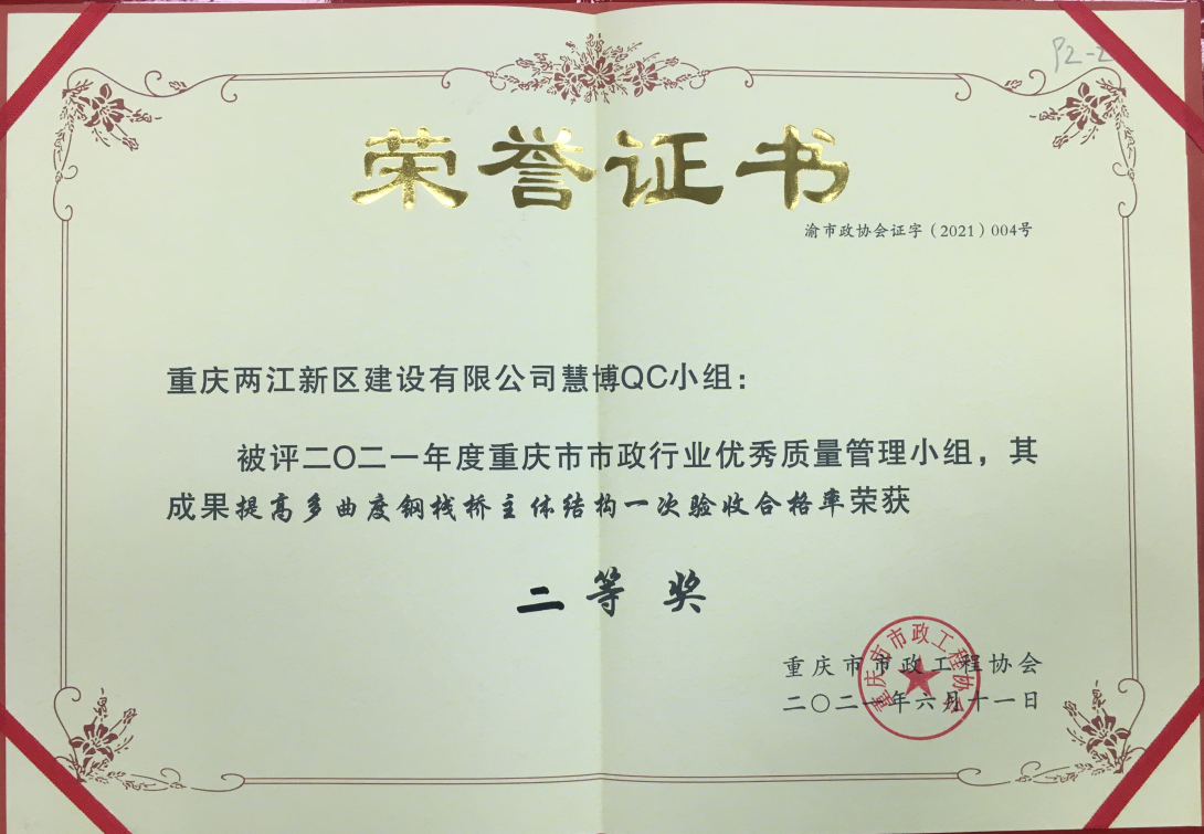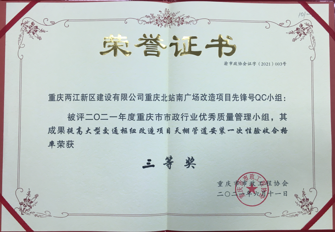 來源:總工辦 林彬 發(fā)布日期:2021/6/17 【打印此文】近日,兩江建設(shè)公司充分發(fā)揮質(zhì)量創(chuàng)新技術(shù)在市政行業(yè)項目的支撐作用,在市政工程項目現(xiàn)場中開展了大量的質(zhì)量管理小組活動,解決了市政工程中的難題,創(chuàng)造出了一些有價值、有創(chuàng)新、有技術(shù)的質(zhì)量QC成果,其中公司兩江新區(qū)禮嘉智慧公園二期慧博QC小組的“提高多曲度鋼棧橋主體結(jié)構(gòu)一次驗收合格率”成果榮獲了2021年度重慶市市政行業(yè)優(yōu)秀質(zhì)量管理小組二等獎,重慶北站南廣場改造項目先鋒號QC小組的“提高大型交通樞紐改造項目天棚管道安裝一次性驗收合格率”成果榮獲2021年度重慶市市政行業(yè)優(yōu)秀質(zhì)量管理小組三等獎。