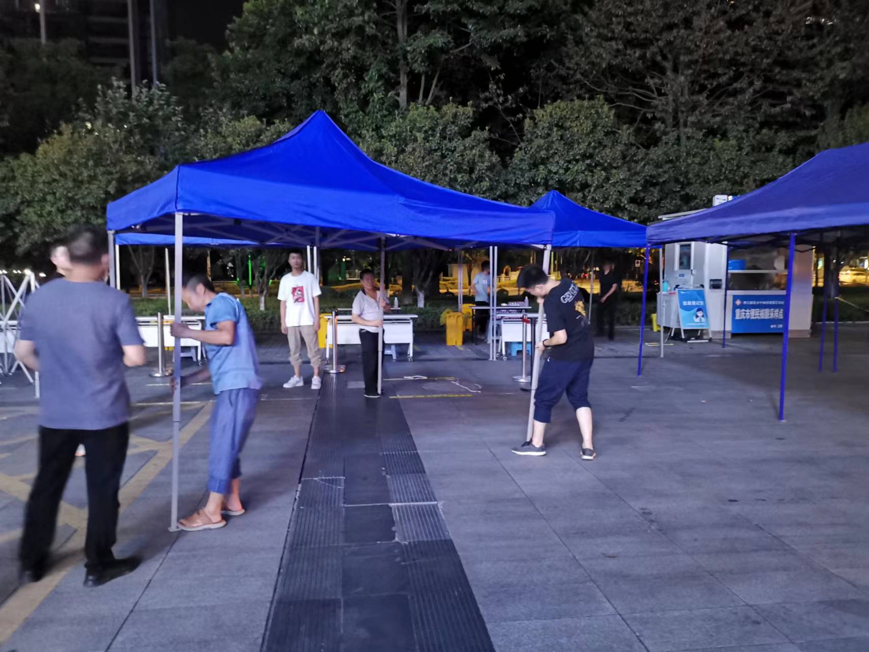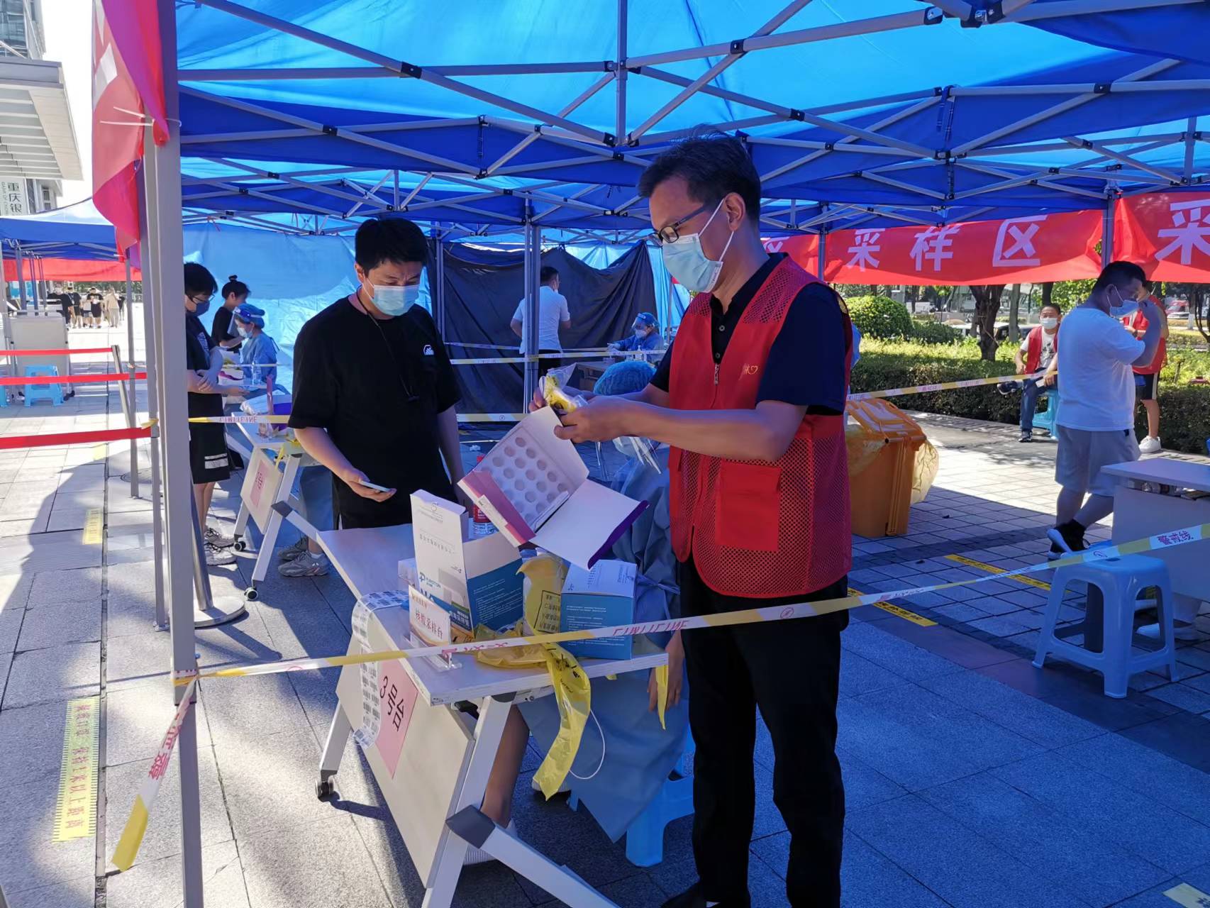 在做好與街道下屬星匯社區(qū)服務(wù)對接工作后,我們配合社區(qū)同志開始了緊張的核檢設(shè)施設(shè)備搭建安裝工作:完成檢測單元的布置,檢測區(qū)域的劃分,檢測通道的完善,檢測環(huán)節(jié)人員的分配和檢測工序的確認(rèn)等工作。通過我們和社區(qū)工作人員密切配合,逐步熟悉并掌握核檢全過程。為數(shù)據(jù)錄入臺和核酸檢測臺準(zhǔn)備醫(yī)療物資,我們能做到提前預(yù)備,做好分類有序配備和及時(shí)補(bǔ)充。搭建遮陽通道帳篷,我們熟練到一小時(shí)能完成30頂。在23日晚的核檢準(zhǔn)備工作過程中,先后接受了星匯社區(qū)領(lǐng)導(dǎo)、新區(qū)委領(lǐng)導(dǎo)們對準(zhǔn)備工作的檢驗(yàn)檢閱,被贊揚(yáng)核檢服務(wù)點(diǎn)現(xiàn)場布置規(guī)范科學(xué),整齊有序。我們的工作得到肯定。盡管準(zhǔn)備完已是深夜11點(diǎn),大家仍然是斗志昂揚(yáng)。