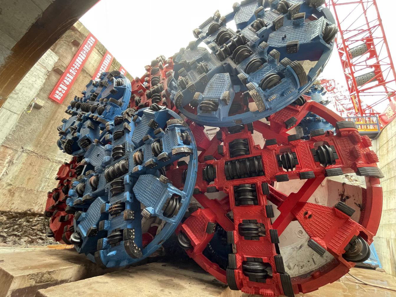 該矩形頂管機寬10.42m,高7.57m,屬世界首次采用六刀盤+六滾筒復合破巖技術,基于項目地質(zhì)特點,在六個圓刀盤的兩側(cè)開挖盲區(qū)和頂部開挖盲區(qū)布置了4個截齒式滾筒破巖裝置,在底部開挖盲區(qū)布置了2個滾刀式滾筒破巖裝置,滿足復合地層或硬巖地層矩形隧道的開挖掘進需求,可針對不同的地質(zhì)情況、施工條件和設計要求選用與之適應的頂推施工方式。使用該設備無需開挖面層便能夠穿越公路、鐵道、河川、地面建筑物、地下構(gòu)筑物以及各種地下管線,在國內(nèi)有明顯的技術優(yōu)勢,可廣泛應用于地鐵出入口、過街通道、綜合管廊、地下車庫、地下商業(yè)街等工程建設。