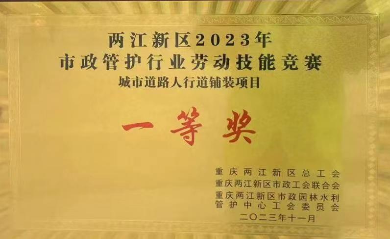 11月16日,兩江建設(shè)公司派出的參賽隊(duì)伍榮獲了兩江新區(qū)2023年市政管護(hù)行業(yè)勞動(dòng)技能競(jìng)賽城市道路人行道鋪裝版塊一等獎(jiǎng)。
