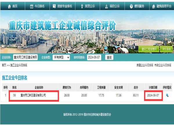 兩江建設公司邁進全市建筑施工企業(yè)誠信綜合評價前100名行列