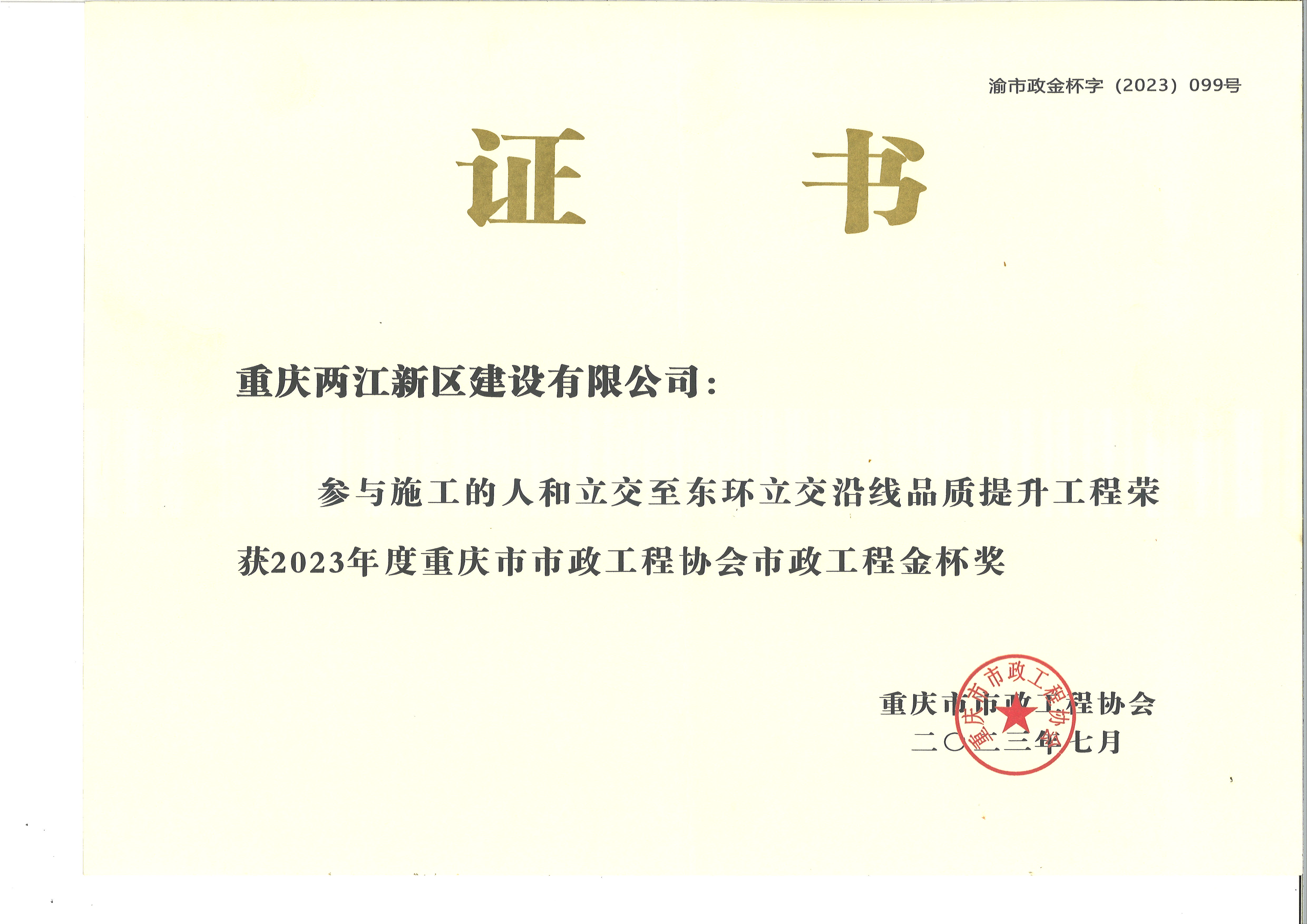 人和立交至東環(huán)立交沿線品質提升工程獲得重慶市市政工程協(xié)會市政工程金杯獎