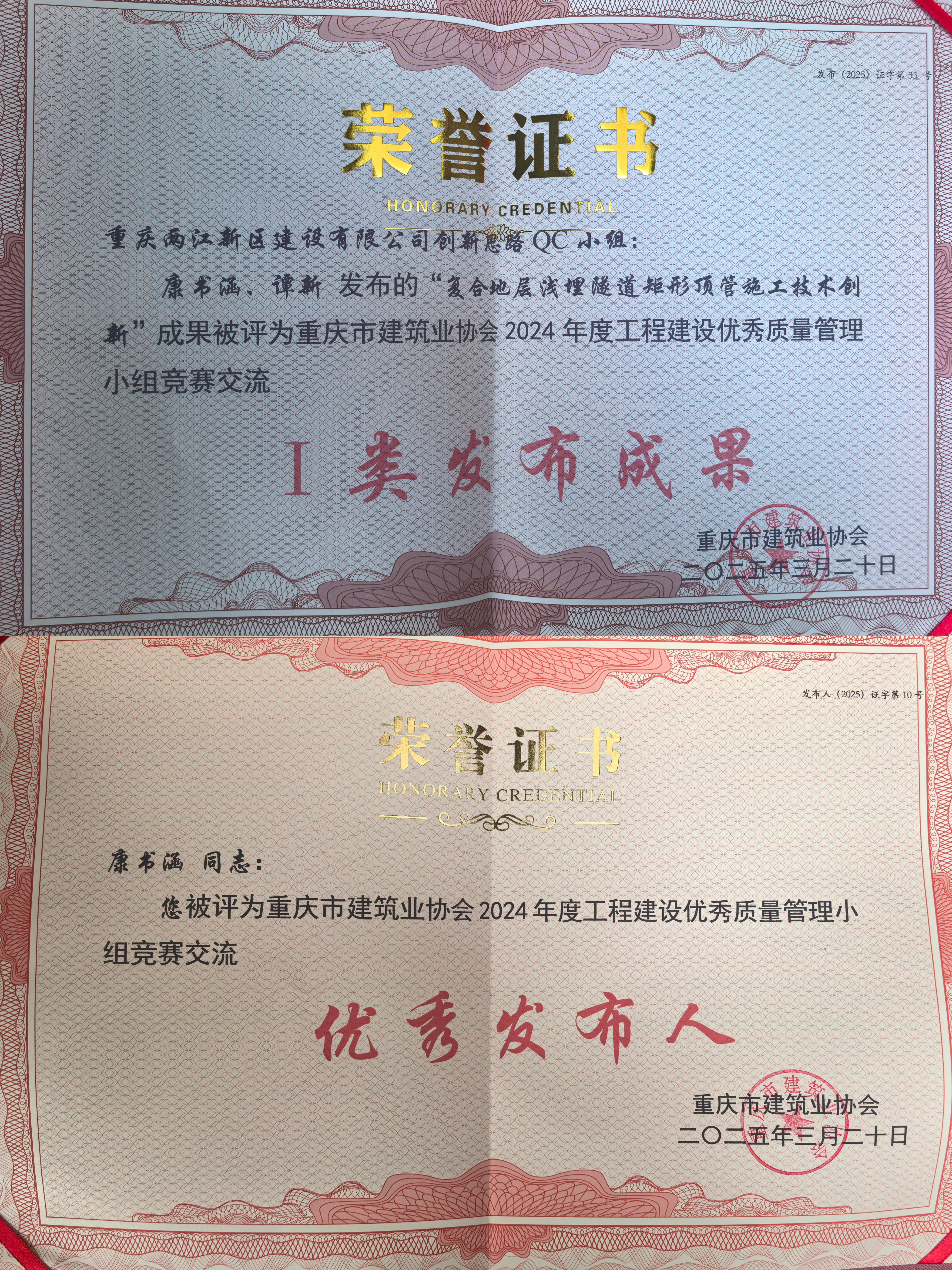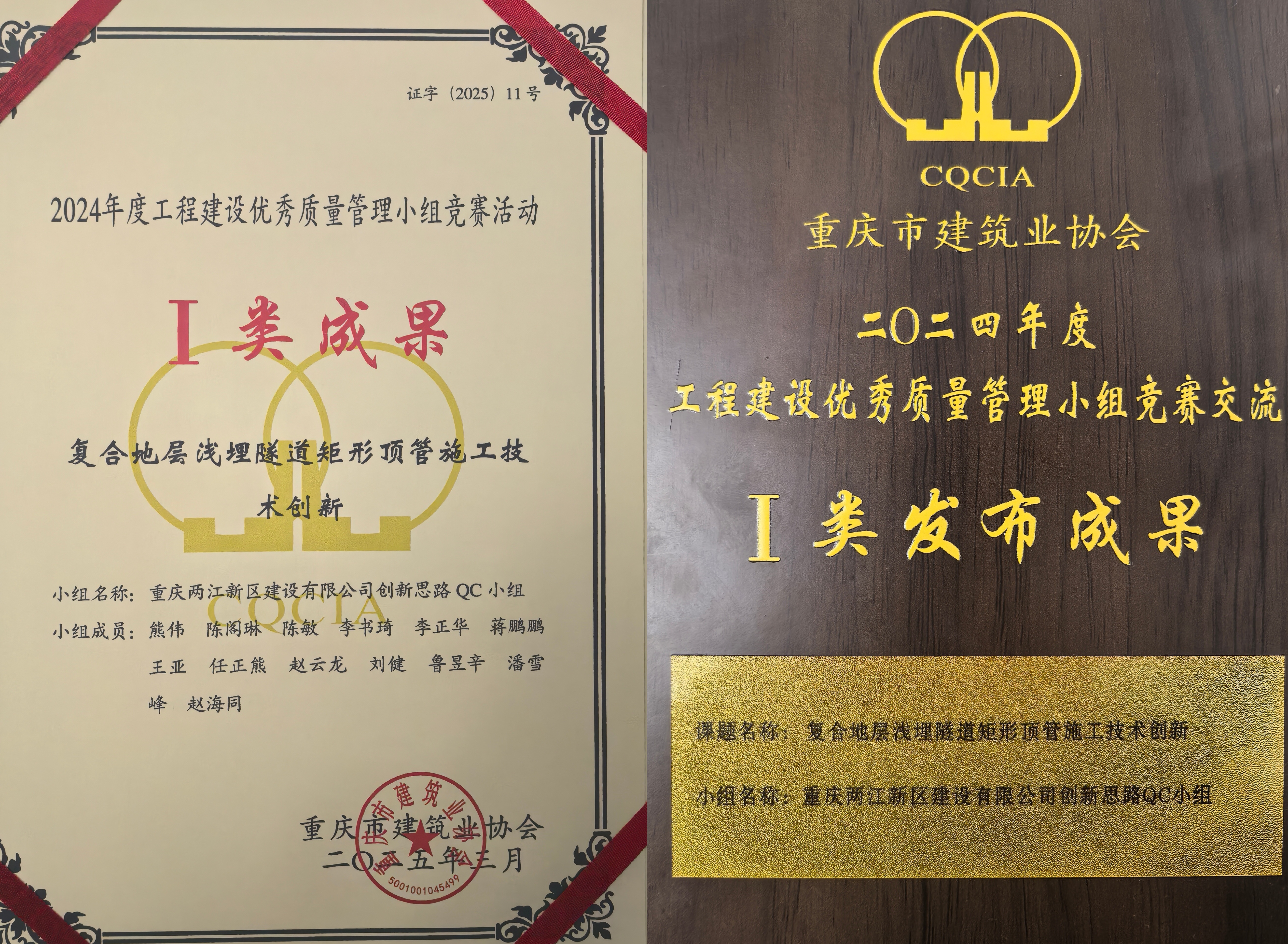 近日,兩江建設(shè)公司在2024年度重慶市工程建設(shè)優(yōu)秀質(zhì)量管理小組活動成果競賽中脫穎而出,憑借《復(fù)合地層淺埋隧道矩形頂管施工技術(shù)創(chuàng)新》榮獲活動競賽的成果和發(fā)布一等獎,這充分展示了公司在工程建設(shè)質(zhì)量管理方面的卓越實力和創(chuàng)新精神。